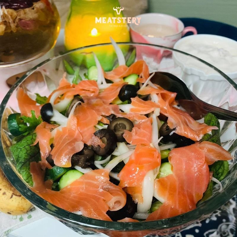 Salad cá hồi xông khói Fossen là lựa chọn hoàn hảo cho những ai yêu thích ẩm thực lành mạnh. Sự kết hợp giữa rau xanh giòn mát, trứng cút, quả oliu và những lát cá hồi béo thơm mang đến món ăn thanh đạm nhưng đầy đủ dưỡng chất, giúp cơ thể nhẹ nhàng mà vẫn tràn đầy năng lượng.