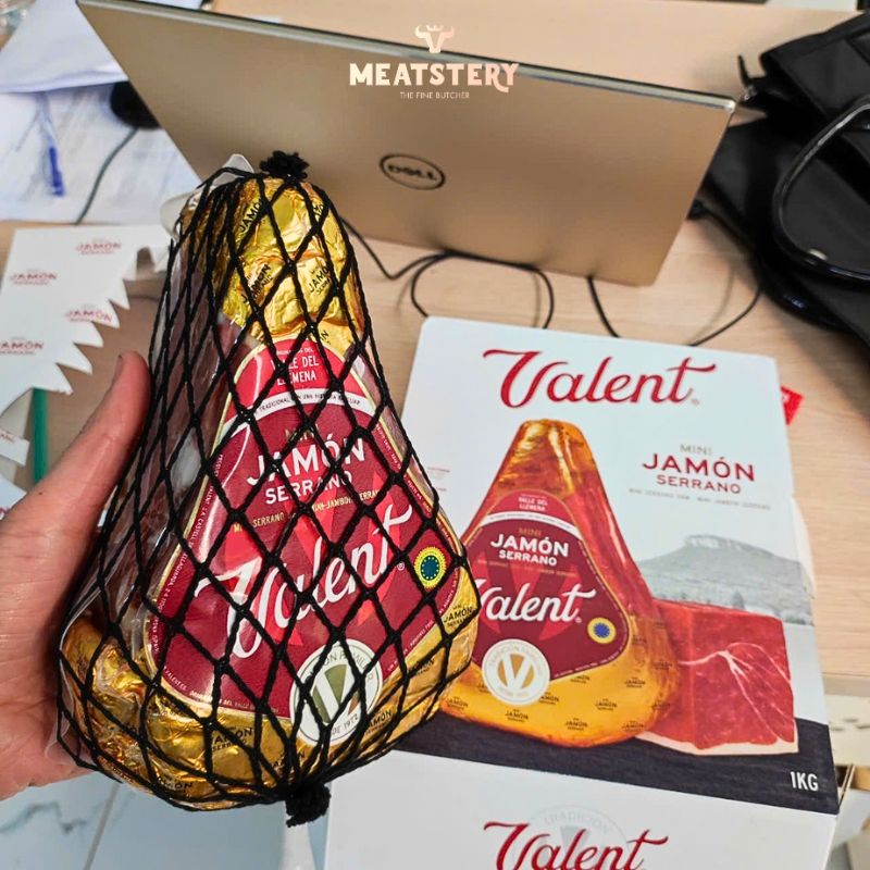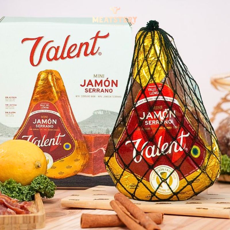 Quá trình ủ kéo dài 18 tháng theo tiêu chuẩn nghiêm ngặt, mang đến phần thịt săn chắc, sắc đỏ đẹp mắt, vị ngọt đậm đà và mùi thơm đặc trưng khó nhầm lẫn. Đùi heo Jamon Sérrano Valent được lọc xương khéo léo, giữ nguyên cấu trúc thịt, giúp việc thưởng thức trở nên tiện lợi hơn mà vẫn đảm bảo chất lượng nguyên bản.
