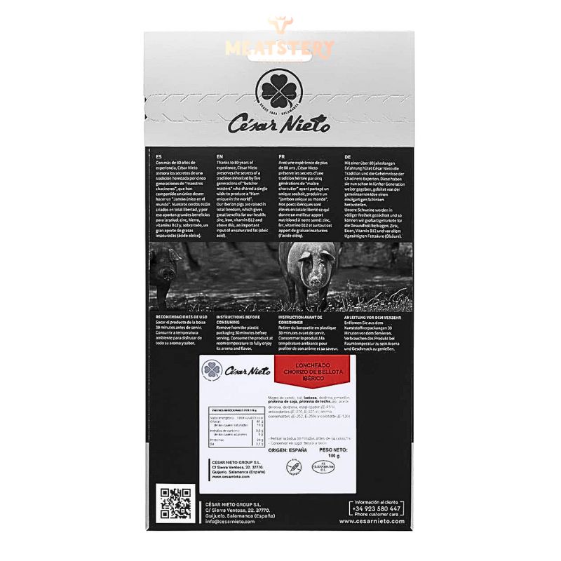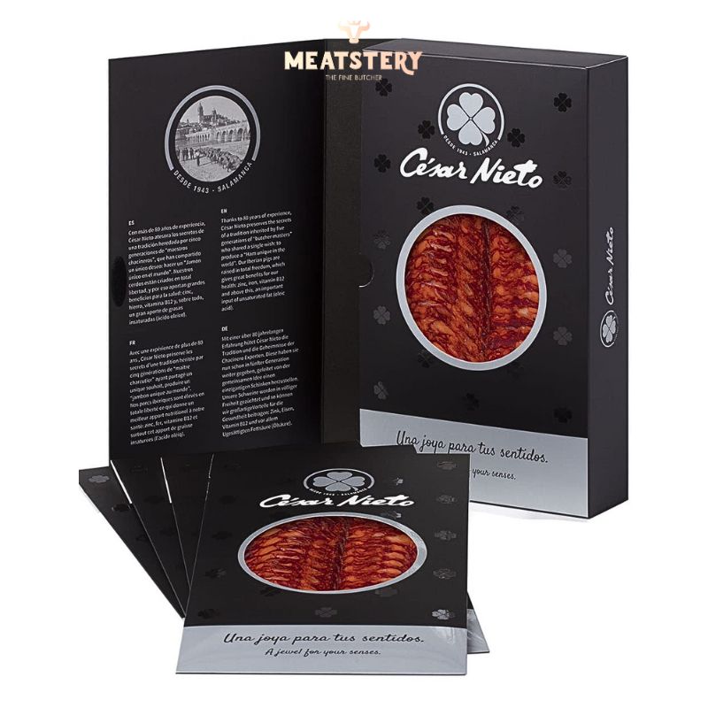 Để tạo nên thịt đùi heo muối thái lát Iberico Chorizo Paprika 100% Natural của César Nieto, những phần thịt nạc tinh túy nhất từ lợn Iberico được tuyển chọn kỹ lưỡng và tẩm ướp theo công thức gia truyền lâu đời của gia đình, được gìn giữ qua nhiều thế hệ. Gia vị chủ đạo là ớt bột Pimentón de La Vera trứ danh cùng tỏi Tây Ban Nha hảo hạng, mang đến hương thơm đặc trưng khó nhầm lẫn.